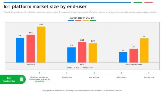 This slide discusses the size of the IoT platform market categorized by end user. The purpose of this slide is to represent the IoT platform market size by end user which includes different regions such as healthcare, retail, etc. The IoT Platform Market Size By End User Exploring Google Cloud IoT Platform is a compilation of the most recent design trends as a series of slides. It is suitable for any subject or industry presentation, containing attractive visuals and photo spots for businesses to clearly express their messages. This template contains a variety of slides for the user to input data, such as structures to contrast two elements, bullet points, and slides for written information. Slidegeeks is prepared to create an impression. This slide discusses the size of the IoT platform market categorized by end user. The purpose of this slide is to represent the IoT platform market size by end user which includes different regions such as healthcare, retail, etc.