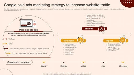 This slide shows to boost website traffic run Google ads. The purpose of this slide is to implement various strategies such as ad extension, and location targeting to enhance traffic in future. It includes parameters such as strategies, benefits, impact, etc. Do you have an important presentation coming up Are you looking for something that will make your presentation stand out from the rest Look no further than Create A Restaurant Marketing Google Paid Ads Marketing Strategy To Increase. With our professional designs, you can trust that your presentation will pop and make delivering it a smooth process. And with Slidegeeks, you can trust that your presentation will be unique and memorable. So why wait Grab Create A Restaurant Marketing Google Paid Ads Marketing Strategy To Increase today and make your presentation stand out from the rest This slide shows to boost website traffic run Google ads. The purpose of this slide is to implement various strategies such as ad extension, and location targeting to enhance traffic in future. It includes parameters such as strategies, benefits, impact, etc.