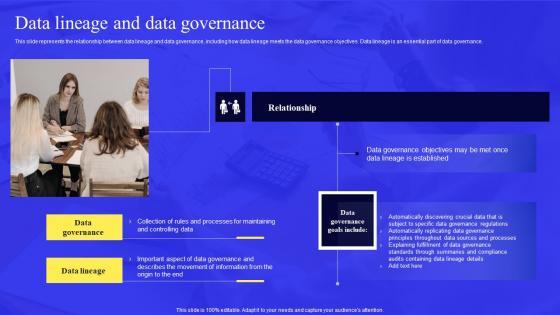 This slide represents the relationship between data lineage and data governance, including how data lineage meets the data governance objectives. Data lineage is an essential part of data governance. Slidegeeks is here to make your presentations a breeze with Business Process Data Lineage Data Lineage And Data Governance Information Pdf With our easy to use and customizable templates, you can focus on delivering your ideas rather than worrying about formatting. With a variety of designs to choose from, you are sure to find one that suits your needs. And with animations and unique photos, illustrations, and fonts, you can make your presentation pop. So whether you are giving a sales pitch or presenting to the board, make sure to check out Slidegeeks first This slide represents the relationship between data lineage and data governance, including how data lineage meets the data governance objectives. Data lineage is an essential part of data governance.