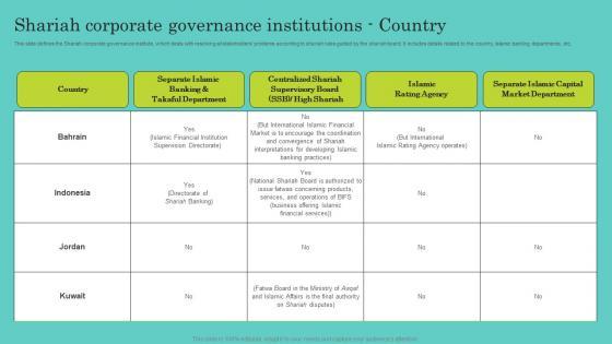This slide defines the Shariah corporate governance institute, which deals with resolving all stakeholders problems according to shariah rules guided by the shariah board. It includes details related to the country, Islamic banking departments, etc. Make sure to capture your audiences attention in your business displays with our gratis customizable In Depth Analysis Of Islamic Banking Shariah Corporate Governance Institutions Country Demonstration PDF. These are great for business strategies, office conferences, capital raising or task suggestions. If you desire to acquire more customers for your tech business and ensure they stay satisfied, create your own sales presentation with these plain slides. This slide defines the Shariah corporate governance institute, which deals with resolving all stakeholders problems according to shariah rules guided by the shariah board. It includes details related to the country, Islamic banking departments, etc.