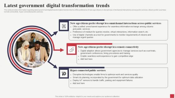 This slide provides information regarding latest government digital transformation trends in terms of the preference of new-age citizens in disrupt-less omnichannel interactions across public services, citizens prefer seamless remote connectivity, hyper-connected public services. This modern and well-arranged Latest Government Digital Transformation Trends Public Sector Digital Solutions Sample Pdf provides lots of creative possibilities. It is very simple to customize and edit with the Powerpoint Software. Just drag and drop your pictures into the shapes. All facets of this template can be edited with Powerpoint no extra software is necessary. Add your own material, put your images in the places assigned for them, adjust the colors, and then you can show your slides to the world, with an animated slide included. This slide provides information regarding latest government digital transformation trends in terms of the preference of new-age citizens in disrupt-less omnichannel interactions across public services, citizens prefer seamless remote connectivity, hyper-connected public services.