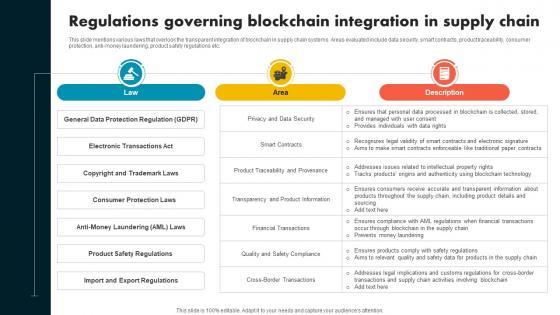 This slide mentions various laws that overlook the transparent integration of blockchain in supply chain systems. Areas evaluated include data security, smart contracts, product traceability, consumer protection, anti-money laundering, product safety regulations etc. This modern and well-arranged Regulations Governing Blockchain Integration In Supply Chain Evolution Harnessing The Power BCT SS V provides lots of creative possibilities. It is very simple to customize and edit with the Powerpoint Software. Just drag and drop your pictures into the shapes. All facets of this template can be edited with Powerpoint, no extra software is necessary. Add your own material, put your images in the places assigned for them, adjust the colors, and then you can show your slides to the world, with an animated slide included. This slide mentions various laws that overlook the transparent integration of blockchain in supply chain systems. Areas evaluated include data security, smart contracts, product traceability, consumer protection, anti-money laundering, product safety regulations etc.