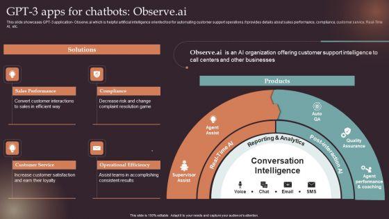 This slide showcases GPT-3 application- Observe.ai which is helpful artificial intelligence oriented tool for automating customer support operations. It provides details about sales performance, compliance, customer service, Real-Time AI, etc. From laying roadmaps to briefing everything in detail, our templates are perfect for you. You can set the stage with your presentation slides. All you have to do is download these easy to edit and customizable templates. Comprehensive Resource Guide To Master GPT 3 GPT 3 Apps For Chatbots Observe AI Topics PDF will help you deliver an outstanding performance that everyone would remember and praise you for. Do download this presentation today.