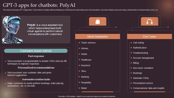 This slide showcases GPT-3 application- PolyAI which is helpful artificial intelligence oriented tool for automating voice chat operations. It provides details about call routing, authentication, troubleshooting, billing, etc. Present like a pro with Comprehensive Resource Guide To Master GPT 3 GPT 3 Apps For Chatbots Polyai Summary PDF Create beautiful presentations together with your team, using our easy to use presentation slides. Share your ideas in real time and make changes on the fly by downloading our templates. So whether you are in the office, on the go, or in a remote location, you can stay in sync with your team and present your ideas with confidence. With Slidegeeks presentation got a whole lot easier. Grab these presentations today.