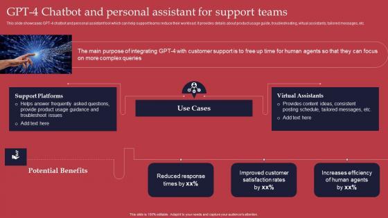 This slide showcases GPT 4 chatbot and personal assistant tool which can help support teams reduce their workload. It provides details about product usage guide, troubleshooting, virtual assistants, tailored messages, etc. Do you have to make sure that everyone on your team knows about any specific topic I yes, then you should give GPT 4 Chatbot And Personal GPT 4 Revolutionary Generative AI Innovation Pictures Pdf a try. Our experts have put a lot of knowledge and effort into creating this impeccable GPT 4 Chatbot And Personal GPT 4 Revolutionary Generative AI Innovation Pictures Pdf. You can use this template for your upcoming presentations, as the slides are perfect to represent even the tiniest detail. You can download these templates from the Slidegeeks website and these are easy to edit. So grab these today This slide showcases GPT 4 chatbot and personal assistant tool which can help support teams reduce their workload. It provides details about product usage guide, troubleshooting, virtual assistants, tailored messages, etc.