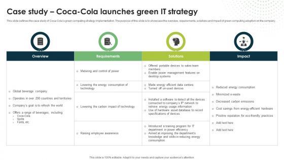 This slide outlines the case study of Coca-Colas green computing strategy implementation. The purpose of this slide is to showcase the overview, requirements, solutions and impact of green computing adoption on the company. Slidegeeks is one of the best resources for PowerPoint templates. You can download easily and regulate Case Study Coca Cola Launches Green IT Strategy Eco Friendly Computing IT for your personal presentations from our wonderful collection. A few clicks is all it takes to discover and get the most relevant and appropriate templates. Use our Templates to add a unique zing and appeal to your presentation and meetings. All the slides are easy to edit and you can use them even for advertisement purposes. This slide outlines the case study of Coca-Colas green computing strategy implementation. The purpose of this slide is to showcase the overview, requirements, solutions and impact of green computing adoption on the company.