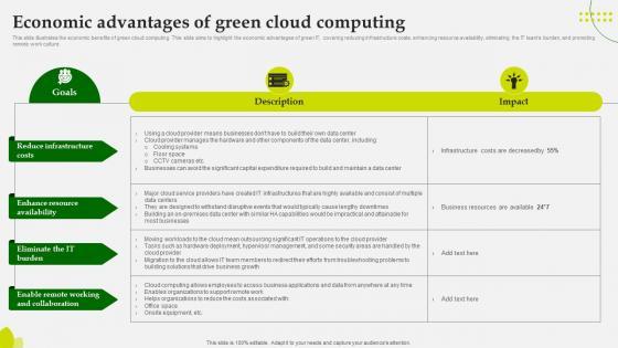 This slide illustrates the economic benefits of green cloud computing. This slide aims to highlight the economic advantages of green IT, covering reducing infrastructure costs, enhancing resource availability, eliminating the IT teams burden, and promoting remote work culture.Slidegeeks is here to make your presentations a breeze with Economic Advantages Of Green Cloud Computing Eco Friendly Computing IT With our easy-to-use and customizable templates, you can focus on delivering your ideas rather than worrying about formatting. With a variety of designs to choose from, you are sure to find one that suits your needs. And with animations and unique photos, illustrations, and fonts, you can make your presentation pop. So whether you are giving a sales pitch or presenting to the board, make sure to check out Slidegeeks first This slide illustrates the economic benefits of green cloud computing. This slide aims to highlight the economic advantages of green IT, covering reducing infrastructure costs, enhancing resource availability, eliminating the IT teams burden, and promoting remote work culture.