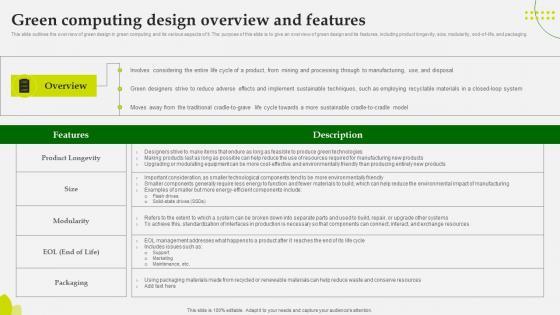This slide outlines the overview of green design in green computing and its various aspects of it. The purpose of this slide is to give an overview of green design and its features, including product longevity, size, modularity, end-of-life, and packaging. Retrieve professionally designed Sustainable Green Computing Design Overview And Features to effectively convey your message and captivate your listeners. Save time by selecting pre-made slideshows that are appropriate for various topics, from business to educational purposes. These themes come in many different styles, from creative to corporate, and all of them are easily adjustable and can be edited quickly. Access them as PowerPoint templates or as Google Slides themes. You do not have to go on a hunt for the perfect presentation because Slidegeeks got you covered from everywhere. This slide outlines the overview of green design in green computing and its various aspects of it. The purpose of this slide is to give an overview of green design and its features, including product longevity, size, modularity, end-of-life, and packaging.