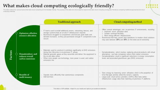 This slide outlines the various factors that make cloud computing environmentally friendly. The purpose of thisslide is to showcase the reasons that make cloud computing ecologically friendly by comparing traditional approaches and cloud computing methods. Crafting an eye-catching presentation has never been more straightforward. Let your presentation shine with this tasteful yet straightforward Green Computing What Makes Cloud Computing Ecologically Friendly template. It offers a minimalistic and classy look that is great for making a statement. The colors have been employed intelligently to add a bit of playfulness while still remaining professional. Construct the ideal Green Computing What Makes Cloud Computing Ecologically Friendly that effortlessly grabs the attention of your audience Begin now and be certain to wow your customers This slide outlines the various factors that make cloud computing environmentally friendly. The purpose of thisslide is to showcase the reasons that make cloud computing ecologically friendly by comparing traditional approaches and cloud computing methods.
