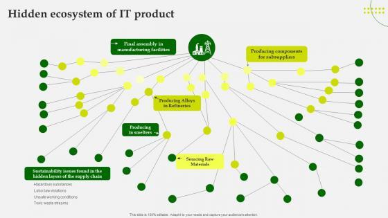 This slide represents thepositive effect of green cloud computing on the environment. The purpose of this slide is to showcase how green IT is providing a more sustainable environment through fewer carbon footprints, less paper usage, less power consumption, providing reliable infrastructure, and so on. Welcome to our selection of the Green Computing Hidden Ecosystem Of It Product These are designed to help you showcase your creativity and bring your sphere to life. Planning and Innovation are essential for any business that is just starting out. This collection contains the designs that you need for your everyday presentations. All of our PowerPoints are 100Percent editable, so you can customize them to suit your needs. This multi-purpose template can be used in various situations. Grab these presentation templates today. This slide represents thepositive effect of green cloud computing on the environment. The purpose of this slide is to showcase how green IT is providing a more sustainable environment through fewer carbon footprints, less paper usage, less power consumption, providing reliable infrastructure, and so on.