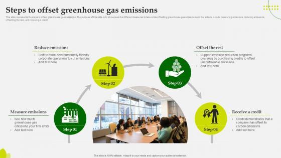 This slide represents the steps to offset greenhouse gas emissions. The purpose of this slide is to showcase the different measures to take while offsetting greenhouse gas emissions and the actions include measuring emissions, reducing emissions, offsetting the rest, and receiving a credit. Make sure to capture your audiences attention in your business displays with our gratis customizable Sustainable Steps To Offset Greenhouse Gas Emissions. These are great for business strategies, office conferences, capital raising or task suggestions. If you desire to acquire more customers for your tech business and ensure they stay satisfied, create your own sales presentation with these plain slides. This slide represents the steps to offset greenhouse gas emissions. The purpose of this slide is to showcase the different measures to take while offsetting greenhouse gas emissions and the actions include measuring emissions, reducing emissions, offsetting the rest, and receiving a credit.