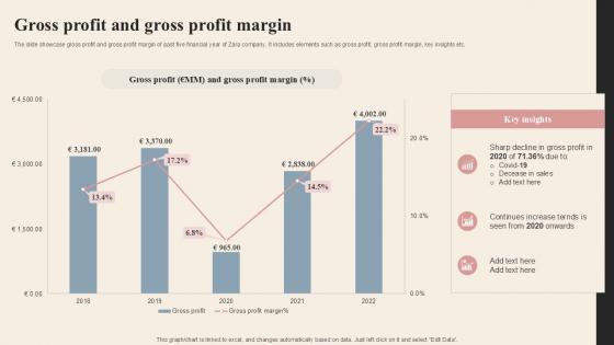The slide showcase gross profit and gross profit margin of past five financial year of Zara company. It includes elements such as gross profit, gross profit margin, key insights etc. If you are looking for a format to display your unique thoughts, then the professionally designed Gross Profit And Gross Profit Margin Branded Clothing Company Profile PPT Example CP SS V is the one for you. You can use it as a Google Slides template or a PowerPoint template. Incorporate impressive visuals, symbols, images, and other charts. Modify or reorganize the text boxes as you desire. Experiment with shade schemes and font pairings. Alter, share or cooperate with other people on your work. Download Gross Profit And Gross Profit Margin Branded Clothing Company Profile PPT Example CP SS V and find out how to give a successful presentation. Present a perfect display to your team and make your presentation unforgettable. The slide showcase gross profit and gross profit margin of past five financial year of Zara company. It includes elements such as gross profit, gross profit margin, key insights etc.