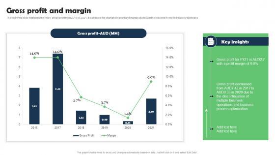 The following slide highlights the yearly gross profit from 2016 to 2021. it illustrates the changes in profit and margin along with the reasons for the increase or decrease. Deliver an awe inspiring pitch with this creative Pureprofile Business Overview Gross Profit And Margin Topics PDF bundle. Topics like Key Insights, Gross Profit AUD, 2016 To 2021 can be discussed with this completely editable template. It is available for immediate download depending on the needs and requirements of the user.