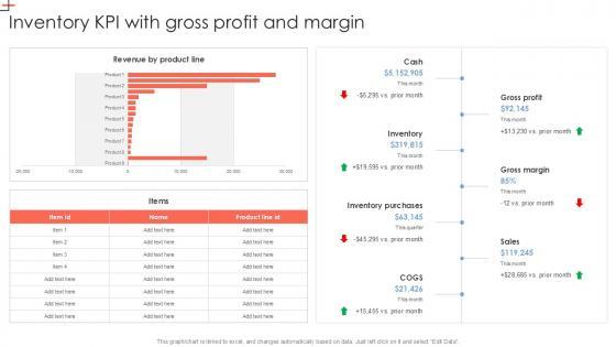 Boost your pitch with our creative Inventory KPI With Gross Profit And Margin PPT Example SS. Deliver an awe-inspiring pitch that will mesmerize everyone. Using these presentation templates you will surely catch everyones attention. You can browse the ppts collection on our website. We have researchers who are experts at creating the right content for the templates. So you do not have to invest time in any additional work. Just grab the template now and use them. Our Inventory KPI With Gross Profit And Margin PPT Example SS are topically designed to provide an attractive backdrop to any subject. Use them to look like a presentation pro.