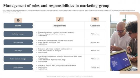 The mentioned slide represents the roles and responsibilities of marketing team responsible for creating brand image and analyze customer needs. Roles include marketing manager, SEO specialist, data analyst, public relations manager, brand strategist etc. Pitch your topic with ease and precision using this Management Of Roles And Responsibilities In Marketing Group Professional Pdf. This layout presents information on Marketing Manager, Data Analyst, Brand Strategist. It is also available for immediate download and adjustment. So, changes can be made in the color, design, graphics or any other component to create a unique layout. The mentioned slide represents the roles and responsibilities of marketing team responsible for creating brand image and analyze customer needs. Roles include marketing manager, SEO specialist, data analyst, public relations manager , brand strategist etc.