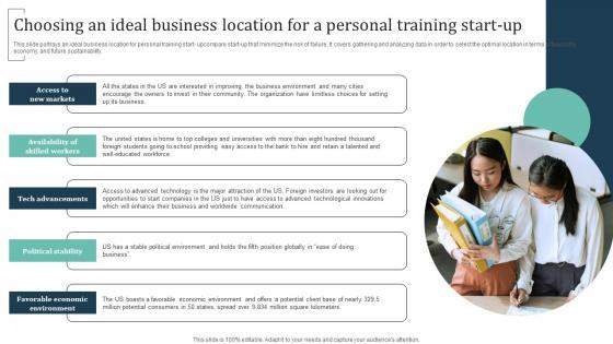 This slide portrays an ideal business location for personal training start- upcompany start-up that minimize the risk of failure. It covers gathering and analyzing data in order to select the optimal location in terms of feasibility, economy, and future sustainability. Crafting an eye-catching presentation has never been more straightforward. Let your presentation shine with this tasteful yet straightforward Choosing An Ideal Business Location For A Personal Training Group Training Business Icons Pdf template. It offers a minimalistic and classy look that is great for making a statement. The colors have been employed intelligently to add a bit of playfulness while still remaining professional. Construct the ideal Choosing An Ideal Business Location For A Personal Training Group Training Business Icons Pdf that effortlessly grabs the attention of your audience. Begin now and be certain to wow your customers. This slide portrays an ideal business location for personal training start- upcompany start-up that minimize the risk of failure. It covers gathering and analyzing data in order to select the optimal location in terms of feasibility, economy, and future sustainability.