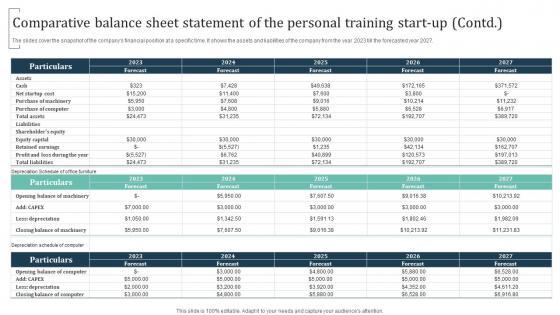 The slides cover the snapshot of the companys financial position at a specific time. It shows the assets and liabilities of the company from the year 2023 till the forecasted year 2027. Make sure to capture your audiences attention in your business displays with our gratis customizable Comparative Balance Sheet Statement Of The Personal Training Group Training Business Template Pdf These are great for business strategies, office conferences, capital raising or task suggestions. If you desire to acquire more customers for your tech business and ensure they stay satisfied, create your own sales presentation with these plain slides. The slides cover the snapshot of the companys financial position at a specific time. It shows the assets and liabilities of the company from the year 2023 till the forecasted year 2027.