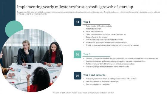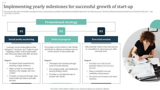 The purpose of this slide is to facilitate managers to convey project progress updates to stakeholders and get their approvals. The slide portrays key milestones of the personal training start-up to be achieved in the year 1, year 3, and years 5 onwards. This Implementing Yearly Milestones For Successful Growth Group Training Business Slides Pdf from Slidegeeks makes it easy to present information on your topic with precision. It provides customization options, so you can make changes to the colors, design, graphics, or any other component to create a unique layout. It is also available for immediate download, so you can begin using it right away. Slidegeeks has done good research to ensure that you have everything you need to make your presentation stand out. Make a name out there for a brilliant performance. The purpose of this slide is to facilitate managers to convey project progress updates to stakeholders and get their approvals. The slide portrays key milestones of the personal training start-up to be achieved in the year 1, year 3, and years 5 onwards.