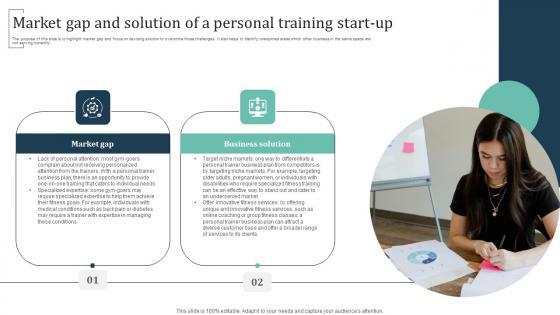 The purpose of this slide is to highlight market gap and focus on devising solution to overcome those challenges. It also helps to identify unexplored areas which other business in the same space are not serving currently. Create an editable Market Gap And Solution Of A Personal Training Start Up Group Training Business Portrait Pdf that communicates your idea and engages your audience. Whether you are presenting a business or an educational presentation, pre-designed presentation templates help save time. Market Gap And Solution Of A Personal Training Start Up Group Training Business Portrait Pdf is highly customizable and very easy to edit, covering many different styles from creative to business presentations. Slidegeeks has creative team members who have crafted amazing templates. So, go and get them without any delay. The purpose of this slide is to highlight market gap and focus on devising solution to overcome those challenges. It also helps to identify unexplored areas which other business in the same space are not serving currently.
