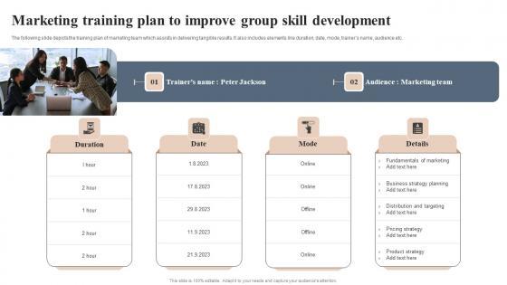 The following slide depicts the training plan of marketing team which assists in delivering tangible results. It also includes elements like duration, date, mode, trainers name, audience etc. Pitch your topic with ease and precision using this Marketing Training Plan To Improve Group Skill Development Structure Pdf. This layout presents information on Fundamentals Of Marketing, Group Skill Development. It is also available for immediate download and adjustment. So, changes can be made in the color, design, graphics or any other component to create a unique layout. The following slide depicts the training plan of marketing team which assists in delivering tangible results. It also includes elements like duration, date, mode, trainers name, audience etc.