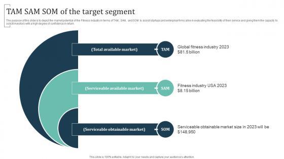 The purpose of this slide is to depict the market potential of the Fitness industry in terms of TAM, SAM, and SOM to assist startups and enterprise firms alike in evaluating the feasibility of their service and giving them the capacity to solicit investors with a high degree of confidence in return. Get a simple yet stunning designed Tam Sam Som Of The Target Segment Group Training Business Topics Pdf It is the best one to establish the tone in your meetings. It is an excellent way to make your presentations highly effective. So, download this PPT today from Slidegeeks and see the positive impacts. Our easy-to-edit Tam Sam Som Of The Target Segment Group Training Business Topics Pdf can be your go-to option for all upcoming conferences and meetings. So, what are you waiting for Grab this template today. The purpose of this slide is to depict the market potential of the Fitness industry in terms of TAM, SAM, and SOM to assist startups and enterprise firms alike in evaluating the feasibility of their service and giving them the capacity to solicit investors with a high degree of confidence in return.