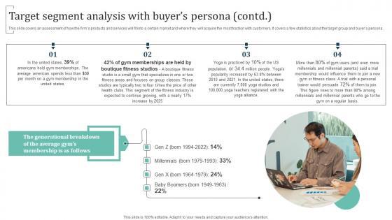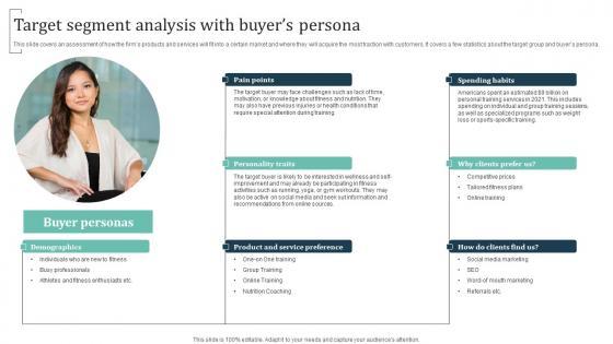This slide covers an assessment of how the firms products and services will fit into a certain market and where they will acquire the most traction with customers. It covers a few statistics about the target group and buyers persona. From laying roadmaps to briefing everything in detail, our templates are perfect for you. You can set the stage with your presentation slides. All you have to do is download these easy-to-edit and customizable templates. Target Segment Analysis With Buyers Persona Group Training Business Formats Pdf will help you deliver an outstanding performance that everyone would remember and praise you for. Do download this presentation today. This slide covers an assessment of how the firms products and services will fit into a certain market and where they will acquire the most traction with customers. It covers a few statistics about the target group and buyers persona.