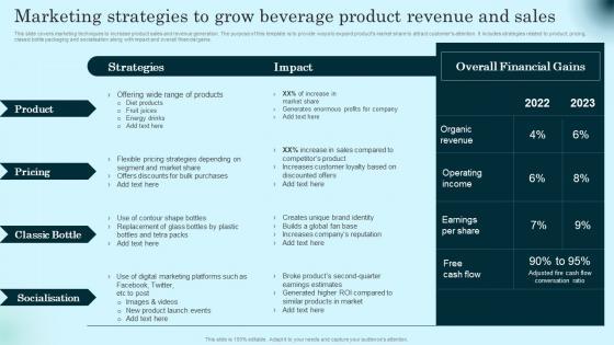 This slide covers marketing techniques to increase product sales and revenue generation. The purpose of this template is to provide ways to expand products market share to attract customers attention. It includes strategies related to product, pricing, classic bottle packaging and socialisation along with impact and overall financial gains. This modern and well arranged Marketing Strategies To Grow Beverage Product Comprehensive Guide To Product Lifecycle Pictures Pdf provides lots of creative possibilities. It is very simple to customize and edit with the Powerpoint Software. Just drag and drop your pictures into the shapes. All facets of this template can be edited with Powerpoint, no extra software is necessary. Add your own material, put your images in the places assigned for them, adjust the colors, and then you can show your slides to the world, with an animated slide included. This slide covers marketing techniques to increase product sales and revenue generation. The purpose of this template is to provide ways to expand products market share to attract customers attention. It includes strategies related to product, pricing, classic bottle packaging and socialisation along with impact and overall financial gains.