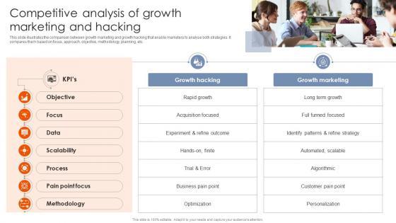 This slide illustrates the comparison between growth marketing and growth hacking that enable marketers to analyse both strategies. It compares them based on focus, approach, objective, methodology, planning, etc. Want to ace your presentation in front of a live audience Our A Comprehensive Guide On Growth Competitive Analysis Of Growth Marketing And Hacking MKT SS V can help you do that by engaging all the users towards you. Slidegeeks experts have put their efforts and expertise into creating these impeccable powerpoint presentations so that you can communicate your ideas clearly. Moreover, all the templates are customizable, and easy-to-edit and downloadable. Use these for both personal and commercial use. This slide illustrates the comparison between growth marketing and growth hacking that enable marketers to analyse both strategies. It compares them based on focus, approach, objective, methodology, planning, etc.