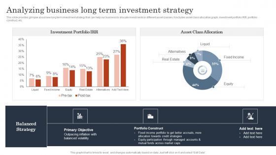 This slide provides glimpse about new long term investment strategy that can help our business to allocate investments in different asset classes. It includes asset class allocation graph, investment portfolio IRR, portfolio construct, etc.There are so many reasons you need a Analyzing Business Long Term Investment Guide To Corporate Financial Growth Plan Structure Pdf. The first reason is you can not spend time making everything from scratch, Thus, Slidegeeks has made presentation templates for you too. You can easily download these templates from our website easily. This slide provides glimpse about new long term investment strategy that can help our business to allocate investments in different asset classes. It includes asset class allocation graph, investment portfolio IRR, portfolio construct, etc.
