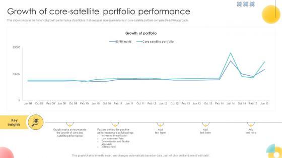 This slide compares the historical growth performance of portfolios. It showcases increase in returns in core-satellite portfolio compared to 60 or 40 approach.This modern and well-arranged Growth Of Core Satellite Portfolio Performance Strategic Investment Plan For Optimizing Risk SS V provides lots of creative possibilities. It is very simple to customize and edit with the Powerpoint Software. Just drag and drop your pictures into the shapes. All facets of this template can be edited with Powerpoint, no extra software is necessary. Add your own material, put your images in the places assigned for them, adjust the colors, and then you can show your slides to the world, with an animated slide included. This slide compares the historical growth performance of portfolios. It showcases increase in returns in core-satellite portfolio compared to 60 or 40 approach.