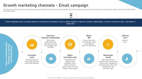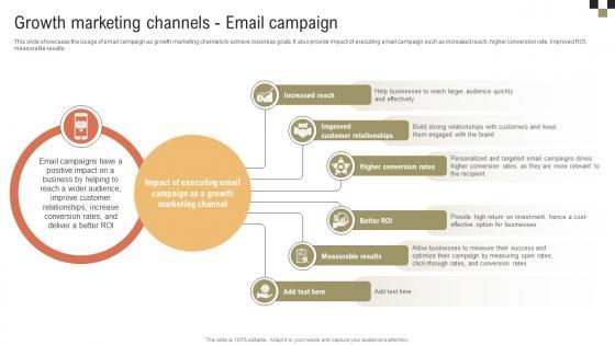 This slide showcases the usage of email campaign as growth marketing channels to achieve business goals. It also provide impact of executing email campaign such as increased reach, higher conversion rate, improved ROI, measurable results. Slidegeeks is here to make your presentations a breeze with Best Practices For Using Growth Marketing Channels Email Campaign MKT SS V With our easy-to-use and customizable templates, you can focus on delivering your ideas rather than worrying about formatting. With a variety of designs to choose from, you are sure to find one that suits your needs. And with animations and unique photos, illustrations, and fonts, you can make your presentation pop. So whether you are giving a sales pitch or presenting to the board, make sure to check out Slidegeeks first This slide showcases the usage of email campaign as growth marketing channels to achieve business goals. It also provide impact of executing email campaign such as increased reach, higher conversion rate, improved ROI, measurable results.