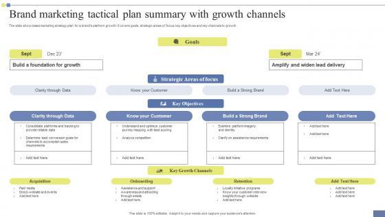 The slide showcases marketing strategy plan for a brands platform growth. It covers goals, strategic areas of focus, key objectives and key channels to growth. Showcasing this set of slides titled Brand Marketing Tactical Plan Summary With Growth Channels Ideas Pdf. The topics addressed in these templates are Acquisition, Onboarding, Build A Strong Brand, Brand Marketing Tactical Plan. All the content presented in this PPT design is completely editable. Download it and make adjustments in color, background, font etc. as per your unique business setting. The slide showcases marketing strategy plan for a brands platform growth. It covers goals, strategic areas of focus, key objectives and key channels to growth.