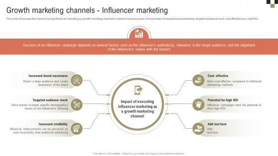 This slide showcases the impact of using influencer marketing as growth marketing channels to achieve business goals. It incorporates increased brand awareness, targeted audience reach, cost effectiveness, high ROI. Retrieve professionally designed A130 A Comprehensive Approach To Growth Growth Marketing Channels Influencer Marketing MKT SS V to effectively convey your message and captivate your listeners. Save time by selecting pre-made slideshows that are appropriate for various topics, from business to educational purposes. These themes come in many different styles, from creative to corporate, and all of them are easily adjustable and can be edited quickly. Access them as PowerPoint templates or as Google Slides themes. You do not have to go on a hunt for the perfect presentation because Slidegeeks got you covered from everywhere. This slide showcases the impact of using influencer marketing as growth marketing channels to achieve business goals. It incorporates increased brand awareness, targeted audience reach, cost effectiveness, high ROI.
