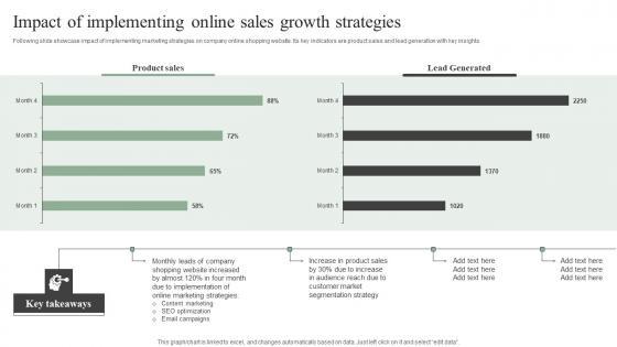 Following slide showcase impact of implementing marketing strategies on company online shopping website. Its key indicators are product sales and lead generation with key insights. Welcome to our selection of the Impact Of Implementing Online Sales Growth Efficient Marketing Tactics Guidelines Pdf. These are designed to help you showcase your creativity and bring your sphere to life. Planning and Innovation are essential for any business that is just starting out. This collection contains the designs that you need for your everyday presentations. All of our PowerPoints are 100 percent editable, so you can customize them to suit your needs. This multi-purpose template can be used in various situations. Grab these presentation templates today Following slide showcase impact of implementing marketing strategies on company online shopping website. Its key indicators are product sales and lead generation with key insights.