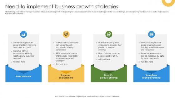 The following slide outlines the major reasons to introduce business growth strategies. Higher sales, increased market share, diversifying product or service offerings, and strengthening brand awareness are the major reasons that are outlined in slide. Retrieve professionally designed Marketing Growth Strategy Need To Implement Business Growth Strategies Strategy SS V to effectively convey your message and captivate your listeners. Save time by selecting pre-made slideshows that are appropriate for various topics, from business to educational purposes. These themes come in many different styles, from creative to corporate, and all of them are easily adjustable and can be edited quickly. Access them as PowerPoint templates or as Google Slides themes. You do not have to go on a hunt for the perfect presentation because Slidegeeks got you covered from everywhere. The following slide outlines the major reasons to introduce business growth strategies. Higher sales, increased market share, diversifying product or service offerings, and strengthening brand awareness are the major reasons that are outlined in slide.
