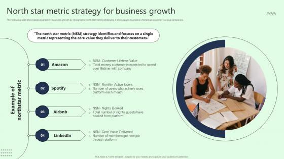 The following slide showcases example of business growth by recognizing north star metric strategies. It showcases examples of strategies used by various companies. Do you know about Slidesgeeks North Star Metric Strategy For Business Growth Icons PDF These are perfect for delivering any kind od presentation. Using it, create PowerPoint presentations that communicate your ideas and engage audiences. Save time and effort by using our pre-designed presentation templates that are perfect for a wide range of topic. Our vast selection of designs covers a range of styles, from creative to business, and are all highly customizable and easy to edit. Download as a PowerPoint template or use them as Google Slides themes.