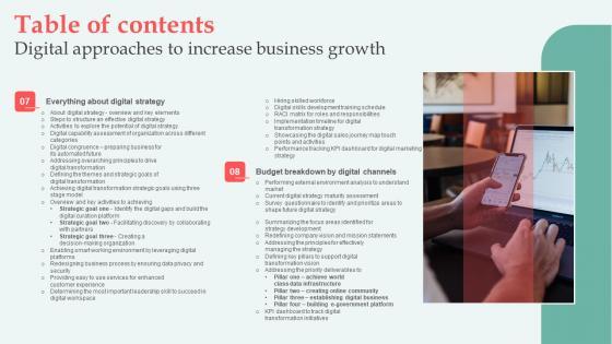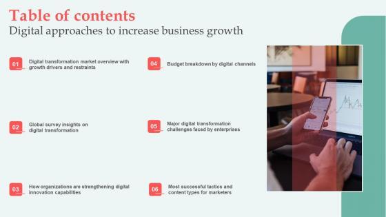Slidegeeks has constructed Table Of Contents Digital Approaches To Increase Business Growth Designs Pdf after conducting extensive research and examination. These presentation templates are constantly being generated and modified based on user preferences and critiques from editors. Here, you will find the most attractive templates for a range of purposes while taking into account ratings and remarks from users regarding the content. This is an excellent jumping off point to explore our content and will give new users an insight into our top notch PowerPoint Templates. Our Table Of Contents Digital Approaches To Increase Business Growth Designs Pdf are topically designed to provide an attractive backdrop to any subject. Use them to look like a presentation pro.