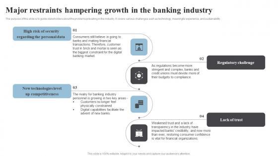 The purpose of this slide is to guide stakeholders about the problems prevailing in the industry. It covers various challenges such as technology, meaningful experience, and sustainability. Create an editable Exploring The Banking Industry A Comprehensive Analysis Major Restraints Hampering Growth In The Banking Brochure PDF that communicates your idea and engages your audience. Whether youre presenting a business or an educational presentation, pre designed presentation templates help save time. Exploring The Banking Industry A Comprehensive Analysis Major Restraints Hampering Growth In The Banking Brochure PDF is highly customizable and very easy to edit, covering many different styles from creative to business presentations. Slidegeeks has creative team members who have crafted amazing templates. So, go and get them without any delay.