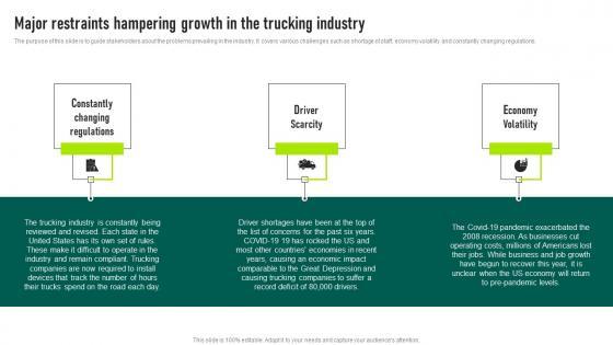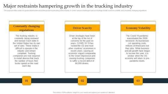 The purpose of this slide is to guide stakeholders about the problems prevailing in the industry. It covers various challenges such as shortage of staff, economy volatility and constantly changing regulations. This Major Restraints Hampering Growth In The Trucking Industry Ideas PDF from Slidegeeks makes it easy to present information on your topic with precision. It provides customization options, so you can make changes to the colors, design, graphics, or any other component to create a unique layout. It is also available for immediate download, so you can begin using it right away. Slidegeeks has done good research to ensure that you have everything you need to make your presentation stand out. Make a name out there for a brilliant performance.