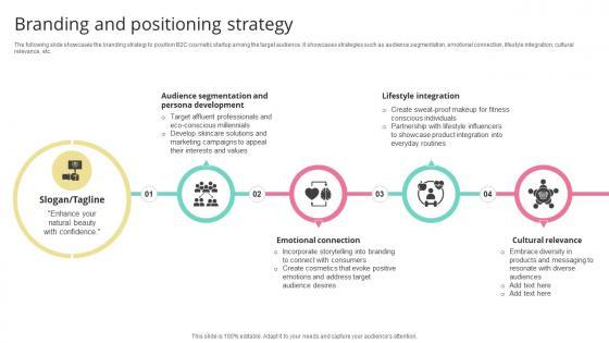 The following slide showcases the branding strategy to position B2C cosmetic startup among the target audience. It showcases strategies such as audience segmentation, emotional connection, lifestyle integration, cultural relevance, etc.Boost your pitch with our creative Branding And Positioning Strategy Skincare Startup GTM Strategy GTM SS V. Deliver an awe-inspiring pitch that will mesmerize everyone. Using these presentation templates you will surely catch everyones attention. You can browse the ppts collection on our website. We have researchers who are experts at creating the right content for the templates. So you do not have to invest time in any additional work. Just grab the template now and use them. The following slide showcases the branding strategy to position B2C cosmetic startup among the target audience. It showcases strategies such as audience segmentation, emotional connection, lifestyle integration, cultural relevance, etc.