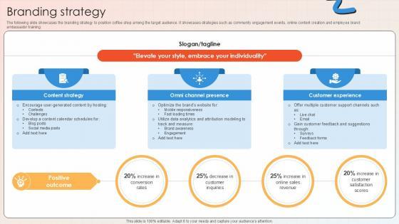 The following slide showcases the branding strategy to position coffee shop among the target audience. It showcases strategies such as community engagement events, online content creation and employee brand ambassador training. Boost your pitch with our creative Branding Strategy Apparel And Shoes E Commerce Market PPT Presentation GTM SS V. Deliver an awe-inspiring pitch that will mesmerize everyone. Using these presentation templates you will surely catch everyones attention. You can browse the ppts collection on our website. We have researchers who are experts at creating the right content for the templates. So you do not have to invest time in any additional work. Just grab the template now and use them. The following slide showcases the branding strategy to position coffee shop among the target audience. It showcases strategies such as community engagement events, online content creation and employee brand ambassador training.