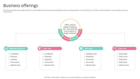 This slide presents the services offered by B2C cosmetic startup business. It includes product offerings such as makeup products, hair, skin and body care. It further includes foundation, mascara, lipsticks, shampoo,sunscreen, etc.Slidegeeks is one of the best resources for PowerPoint templates. You can download easily and regulate Business Offerings Skincare Startup GTM Strategy GTM SS V for your personal presentations from our wonderful collection. A few clicks is all it takes to discover and get the most relevant and appropriate templates. Use our Templates to add a unique zing and appeal to your presentation and meetings. All the slides are easy to edit and you can use them even for advertisement purposes. This slide presents the services offered by B2C cosmetic startup business. It includes product offerings such as makeup products, hair, skin and body care. It further includes foundation, mascara, lipsticks, shampoo,sunscreen, etc.