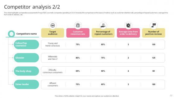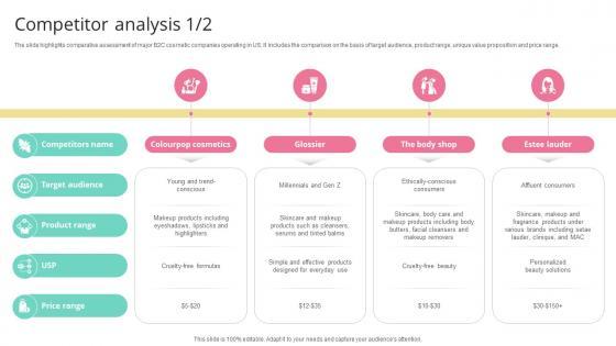 The slide highlights comparative assessment of major B2C cosmetic companies operating in US. It includes the comparison on the basis of target audience, product range, unique value proposition and price range.Want to ace your presentation in front of a live audience Our Competitor Analysis Skincare Startup GTM Strategy GTM SS V can help you do that by engaging all the users towards you. Slidegeeks experts have put their efforts and expertise into creating these impeccable powerpoint presentations so that you can communicate your ideas clearly. Moreover, all the templates are customizable, and easy-to-edit and downloadable. Use these for both personal and commercial use. The slide highlights comparative assessment of major B2C cosmetic companies operating in US. It includes the comparison on the basis of target audience, product range, unique value proposition and price range.