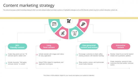 The slide showcases content marketing strategy for B2C cosmetic startup to attract and retain audience. It highlights strategies such as SEO-friendly content, long-form content, interactive content, etc.There are so many reasons you need a Content Marketing Strategy Skincare Startup GTM Strategy GTM SS V. The first reason is you can not spend time making everything from scratch, Thus, Slidegeeks has made presentation templates for you too. You can easily download these templates from our website easily. The slide showcases content marketing strategy for B2C cosmetic startup to attract and retain audience. It highlights strategies such as SEO-friendly content, long-form content, interactive content, etc.