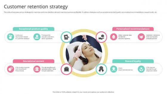 The slide showcases various strategies to maximize customer retention rate and maximize business profitability. It outlines strategies such as exceptional product quality, personalized recommendations, reward loyalty, etc.From laying roadmaps to briefing everything in detail, our templates are perfect for you. You can set the stage with your presentation slides. All you have to do is download these easy-to-edit and customizable templates. Customer Retention Strategy Skincare Startup GTM Strategy GTM SS V will help you deliver an outstanding performance that everyone would remember and praise you for. Do download this presentation today. The slide showcases various strategies to maximize customer retention rate and maximize business profitability. It outlines strategies such as exceptional product quality, personalized recommendations, reward loyalty, etc.