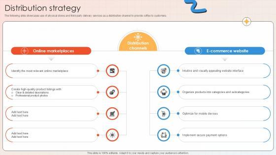 The following slide showcases use of physical stores and third-party delivery services as a distribution channel to provide coffee to customers. From laying roadmaps to briefing everything in detail, our templates are perfect for you. You can set the stage with your presentation slides. All you have to do is download these easy-to-edit and customizable templates. Distribution Strategy Apparel And Shoes E Commerce Market PPT Template GTM SS V will help you deliver an outstanding performance that everyone would remember and praise you for. Do download this presentation today. The following slide showcases use of physical stores and third-party delivery services as a distribution channel to provide coffee to customers.