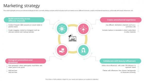 This slide highlights various promotional strategies for B2C cosmetic startup company which includes build community across different channels, create omnichannel experience, collaborate with beauty influencers, etc.Crafting an eye-catching presentation has never been more straightforward. Let your presentation shine with this tasteful yet straightforward Marketing Strategy Skincare Startup GTM Strategy GTM SS V template. It offers a minimalistic and classy look that is great for making a statement. The colors have been employed intelligently to add a bit of playfulness while still remaining professional. Construct the ideal Marketing Strategy Skincare Startup GTM Strategy GTM SS V that effortlessly grabs the attention of your audience Begin now and be certain to wow your customers This slide highlights various promotional strategies for B2C cosmetic startup company which includes build community across different channels, create omnichannel experience, collaborate with beauty influencers, etc.