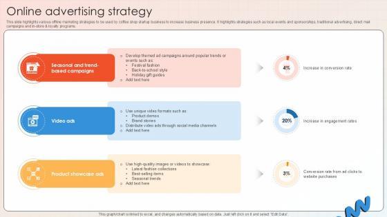 This slide highlights various offline marketing strategies to be used by coffee shop startup business to increase business presence. It highlights strategies such as local events and sponsorships, traditional advertising, direct mail campaigns and in-store and loyalty programs. Are you in need of a template that can accommodate all of your creative concepts This one is crafted professionally and can be altered to fit any style. Use it with Google Slides or PowerPoint. Include striking photographs, symbols, depictions, and other visuals. Fill, move around, or remove text boxes as desired. Test out color palettes and font mixtures. Edit and save your work, or work with colleagues. Download Online Advertising Strategy Apparel And Shoes E Commerce Market PPT Example GTM SS V and observe how to make your presentation outstanding. Give an impeccable presentation to your group and make your presentation unforgettable. This slide highlights various offline marketing strategies to be used by coffee shop startup business to increase business presence. It highlights strategies such as local events and sponsorships, traditional advertising, direct mail campaigns and in-store and loyalty programs.