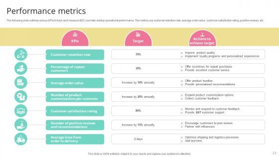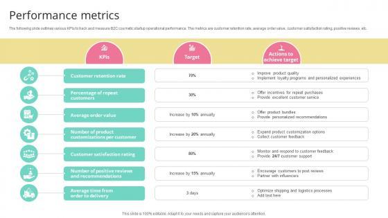 The following slide outlines various KPIs to track and measure B2C cosmetic startup operational performance. The metrics are customer retention rate, average order value, customer satisfaction rating, positive reviews, etc.Make sure to capture your audiences attention in your business displays with our gratis customizable Performance Metrics Skincare Startup GTM Strategy GTM SS V. These are great for business strategies, office conferences, capital raising or task suggestions. If you desire to acquire more customers for your tech business and ensure they stay satisfied, create your own sales presentation with these plain slides. The following slide outlines various KPIs to track and measure B2C cosmetic startup operational performance. The metrics are customer retention rate, average order value, customer satisfaction rating, positive reviews, etc.
