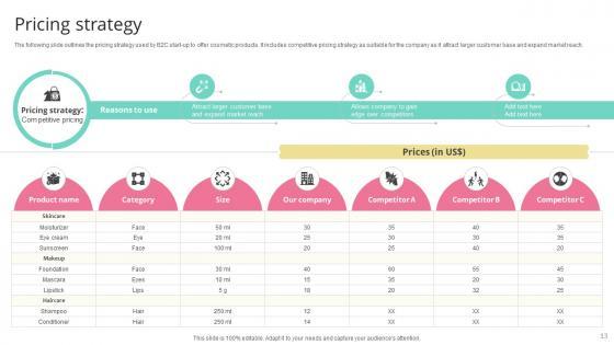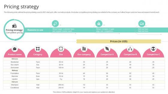 The following slide outlines the pricing strategy used by B2C start-up to offer cosmetic products. It includes competitive pricing strategy as suitable for the company as it attract larger customer base and expand market reach.Formulating a presentation can take up a lot of effort and time, so the content and message should always be the primary focus. The visuals of the PowerPoint can enhance the presenters message, so our Pricing Strategy Skincare Startup GTM Strategy GTM SS V was created to help save time. Instead of worrying about the design, the presenter can concentrate on the message while our designers work on creating the ideal templates for whatever situation is needed. Slidegeeks has experts for everything from amazing designs to valuable content, we have put everything into Pricing Strategy Skincare Startup GTM Strategy GTM SS V. The following slide outlines the pricing strategy used by B2C start-up to offer cosmetic products. It includes competitive pricing strategy as suitable for the company as it attract larger customer base and expand market reach.